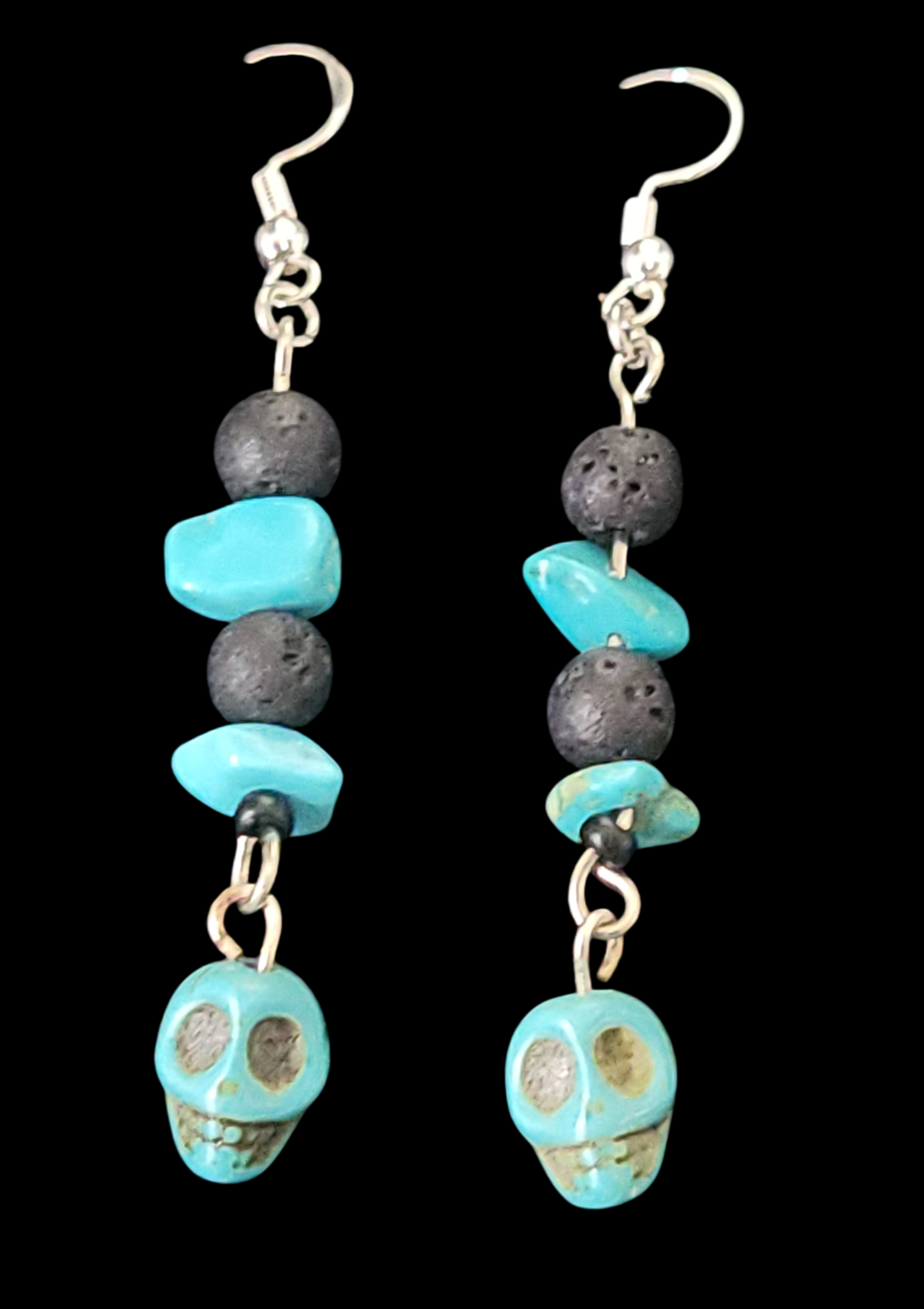 Stones and Bones Earrings blend natural gemstone elegance with bold artistic expression. Painted turquoise skulls are stacked with multiple configurations of gemstones and beads, each pair anchored by surgical steel hooks designed for sensitive skin. Choose from various stacked arrangements to find the composition that complements your personal style—a refined statement piece for those who embrace individuality.