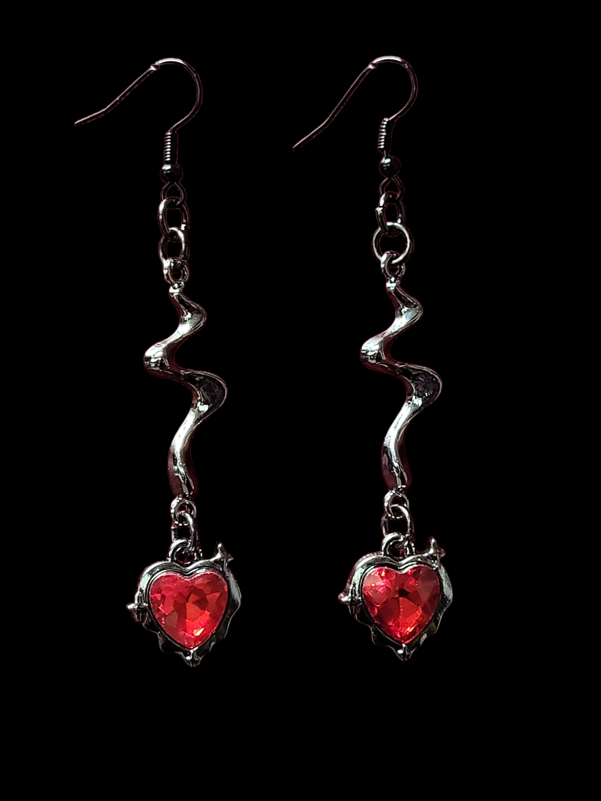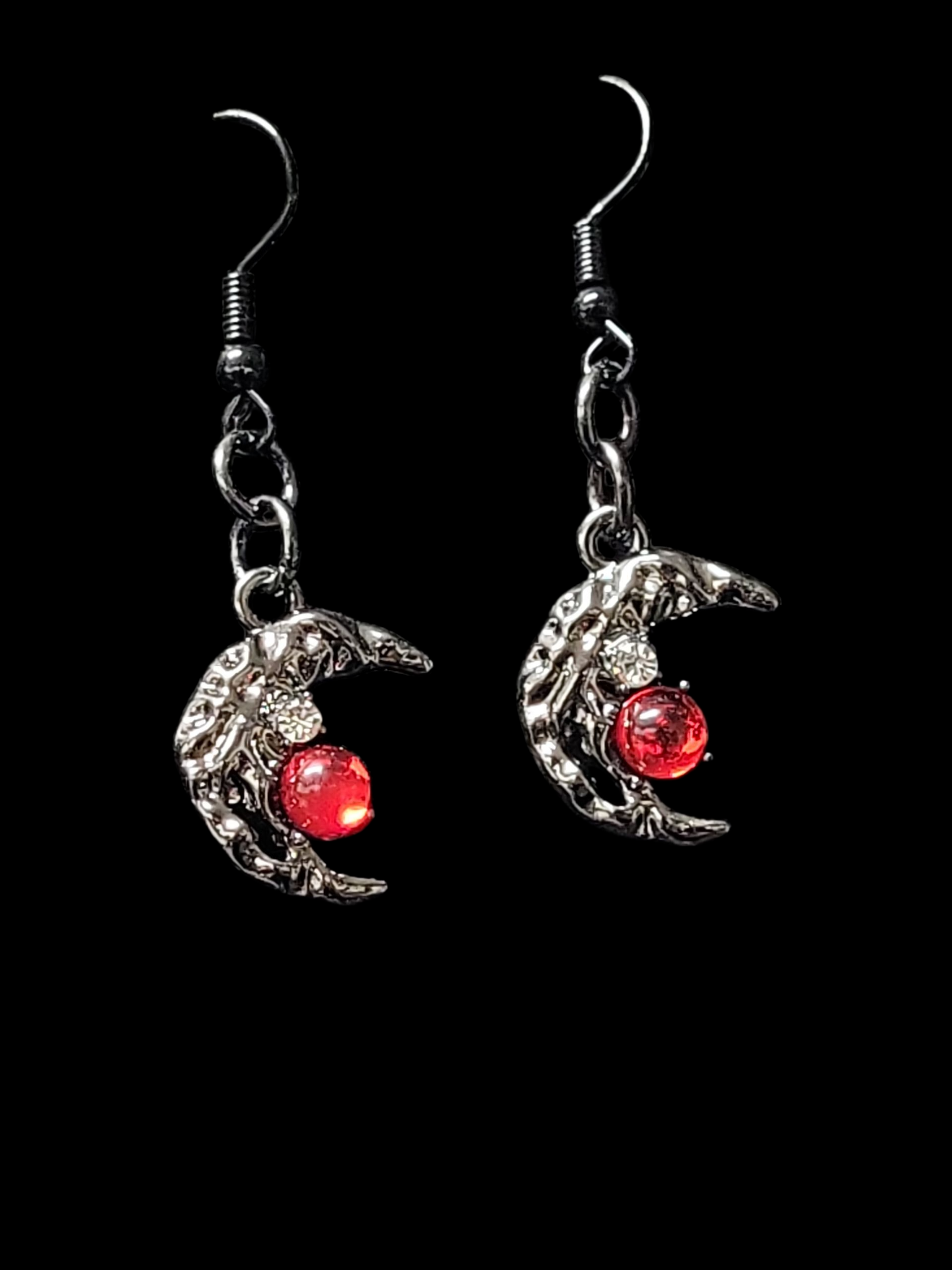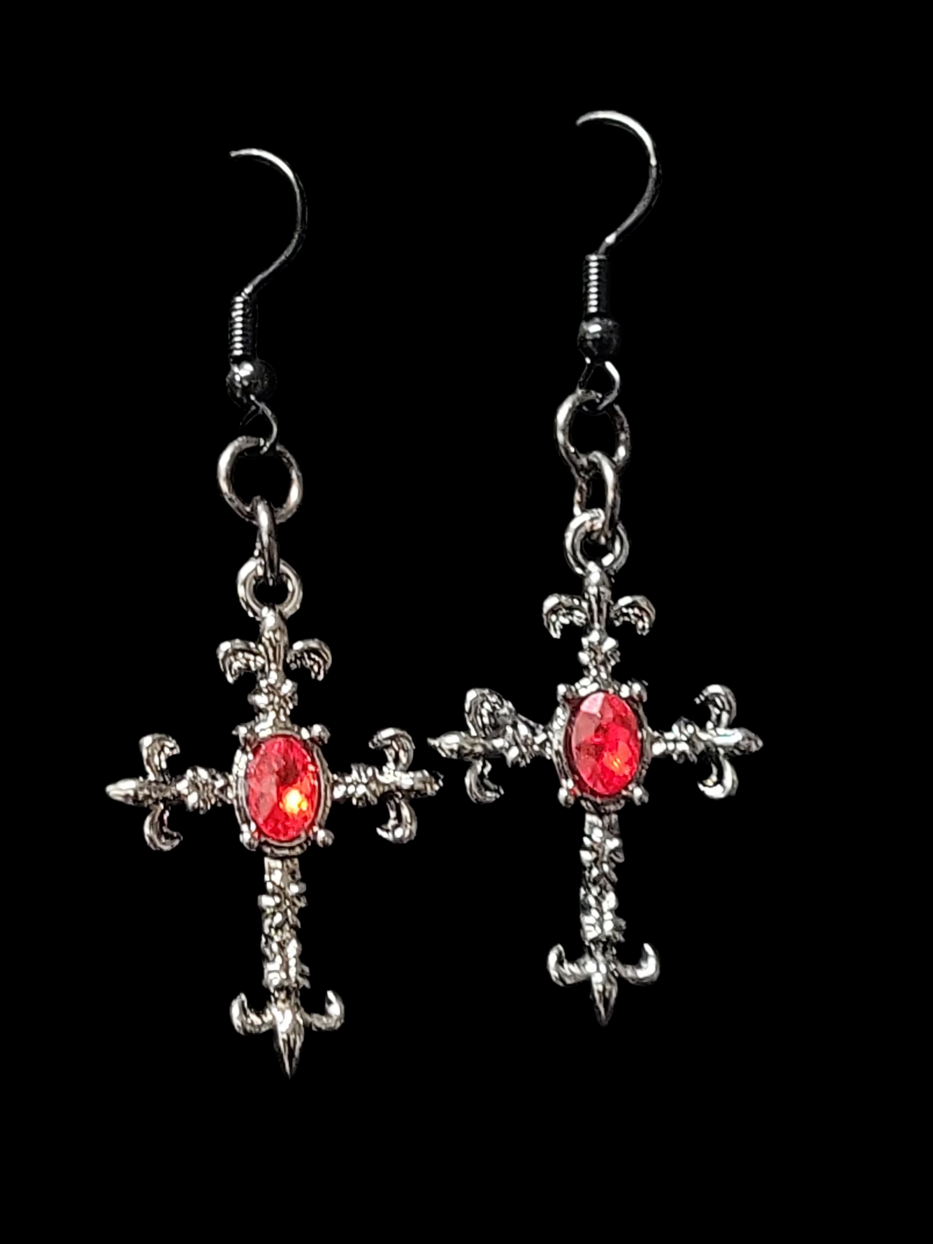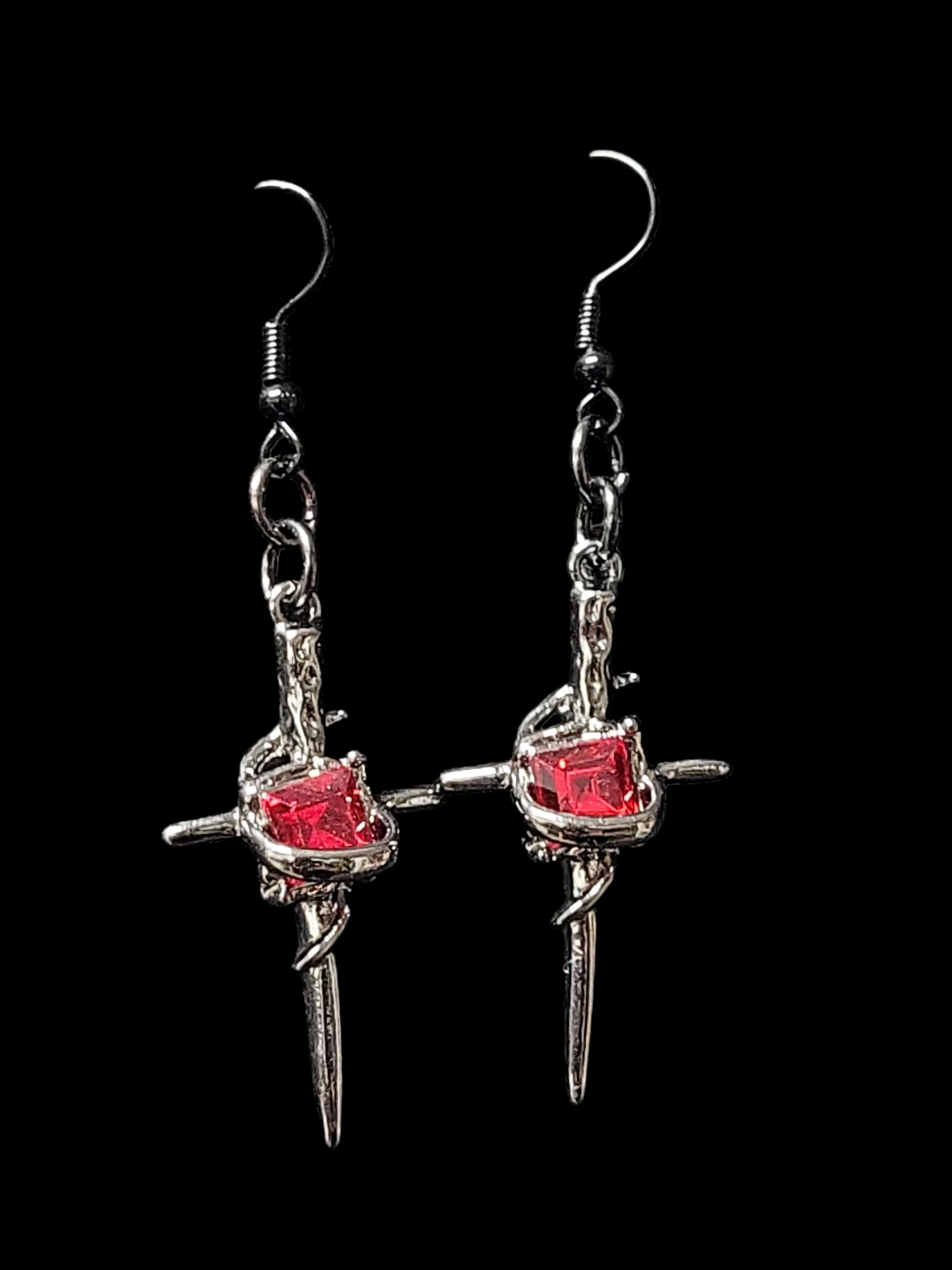 Expertly crafted, these hand made earrings feature a polished dark metal design and a captivating red stone accent. Add a touch of gothic elegance to any outfit with these enchanting earrings.