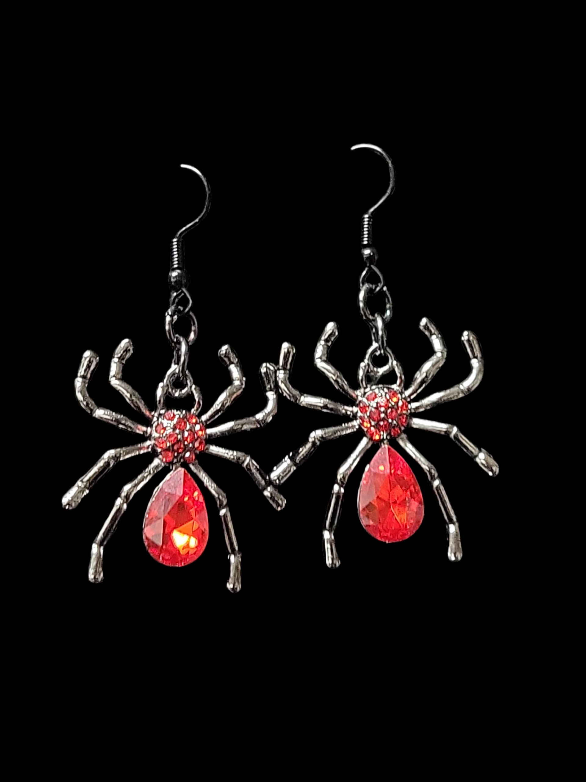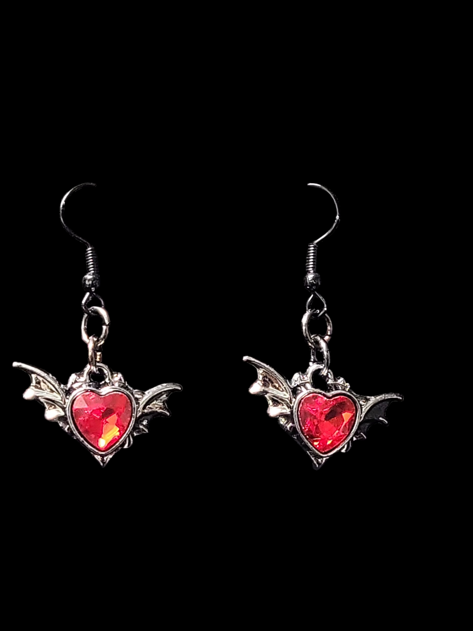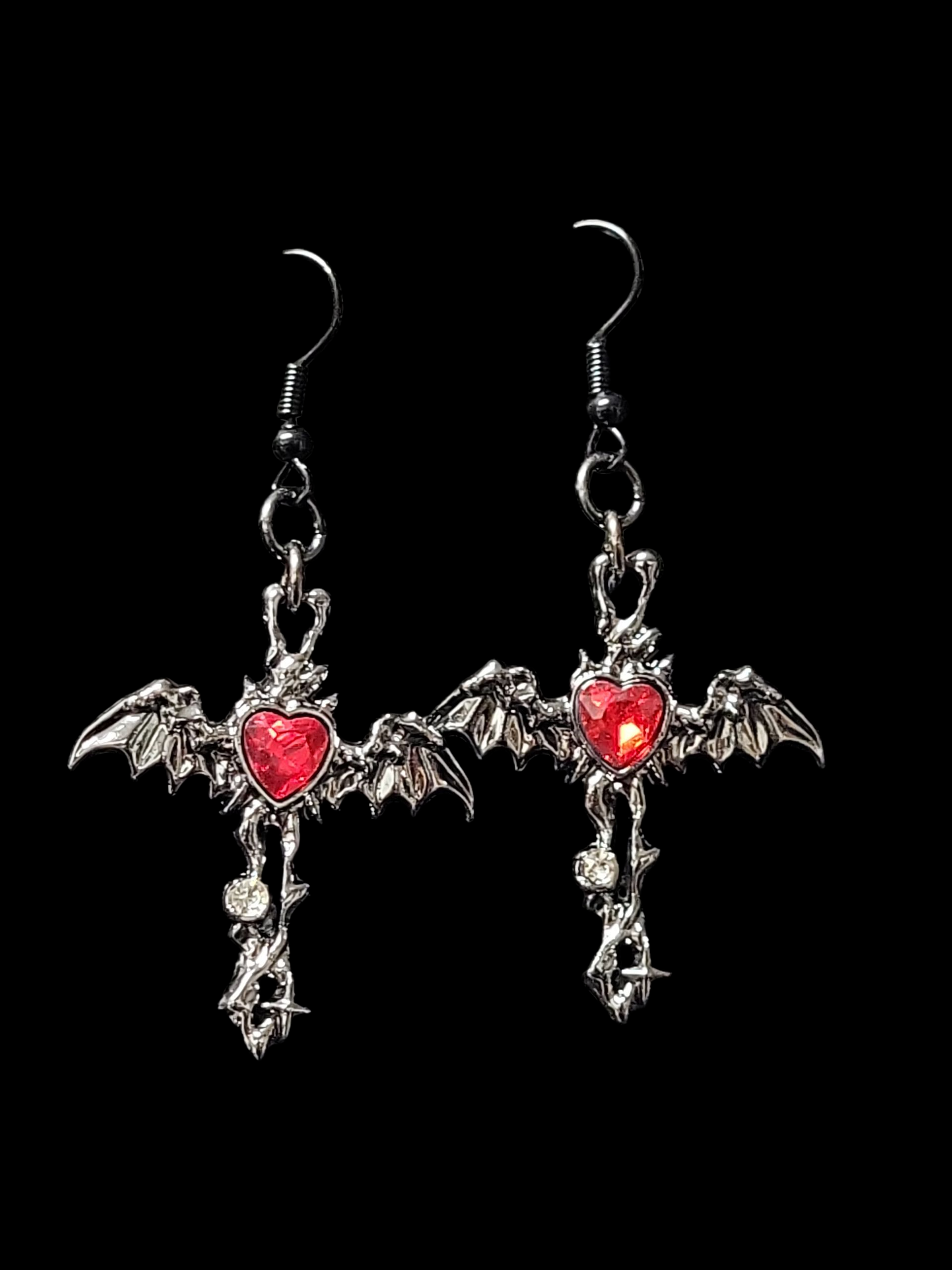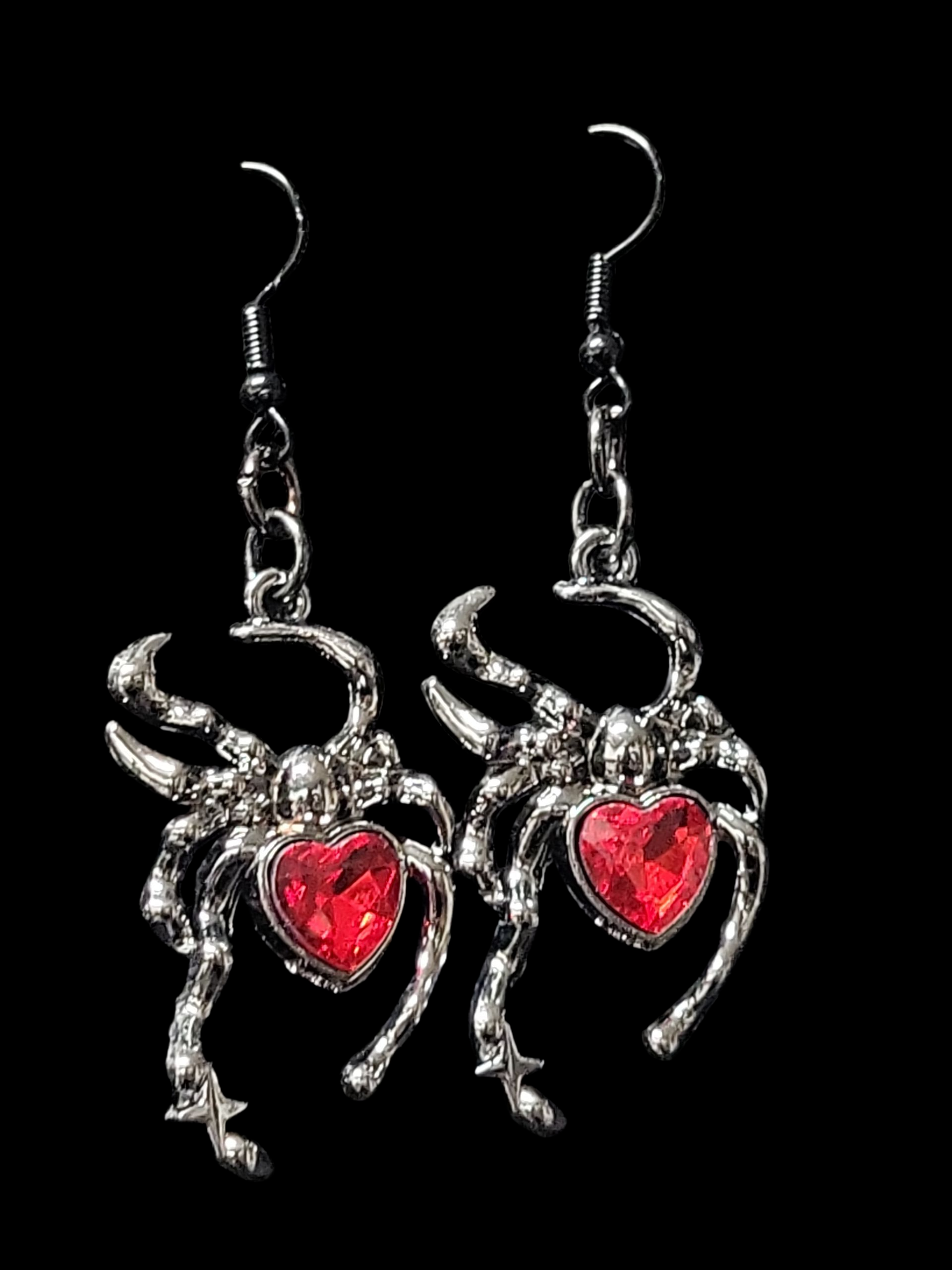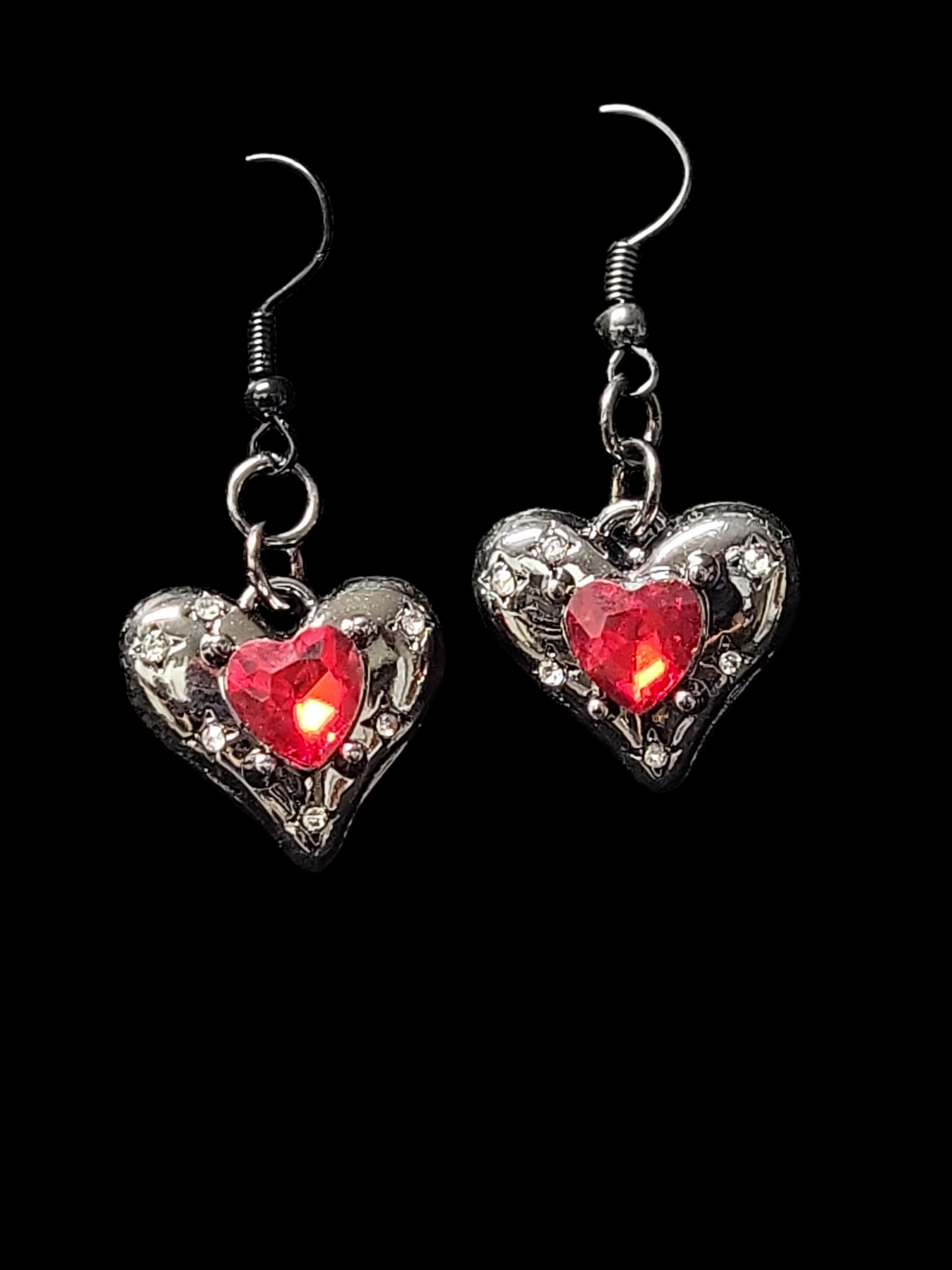 Expertly crafted, these hand made earrings feature a polished dark metal design and a captivating red stone accent. Add a touch of gothic elegance to any outfit with these enchanting earrings.